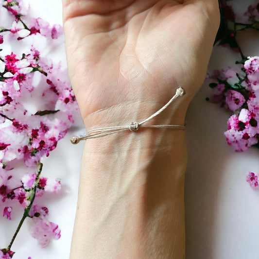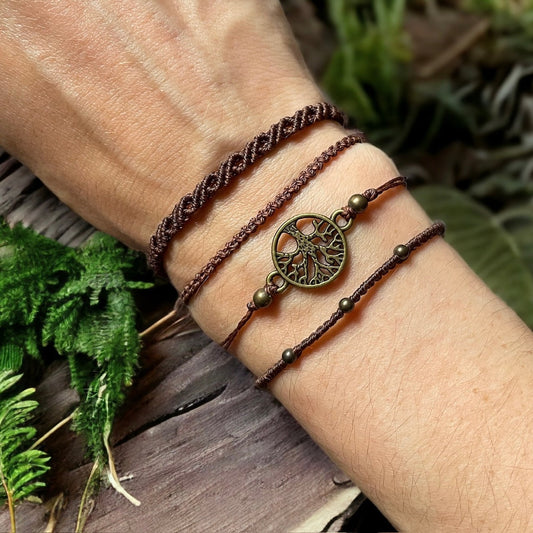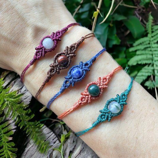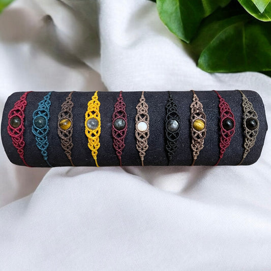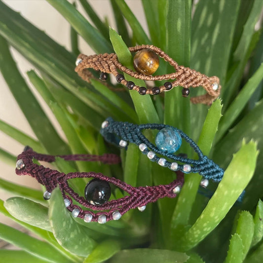 Cette collection est composée de bracelets en micro-macramé, faits à la main.