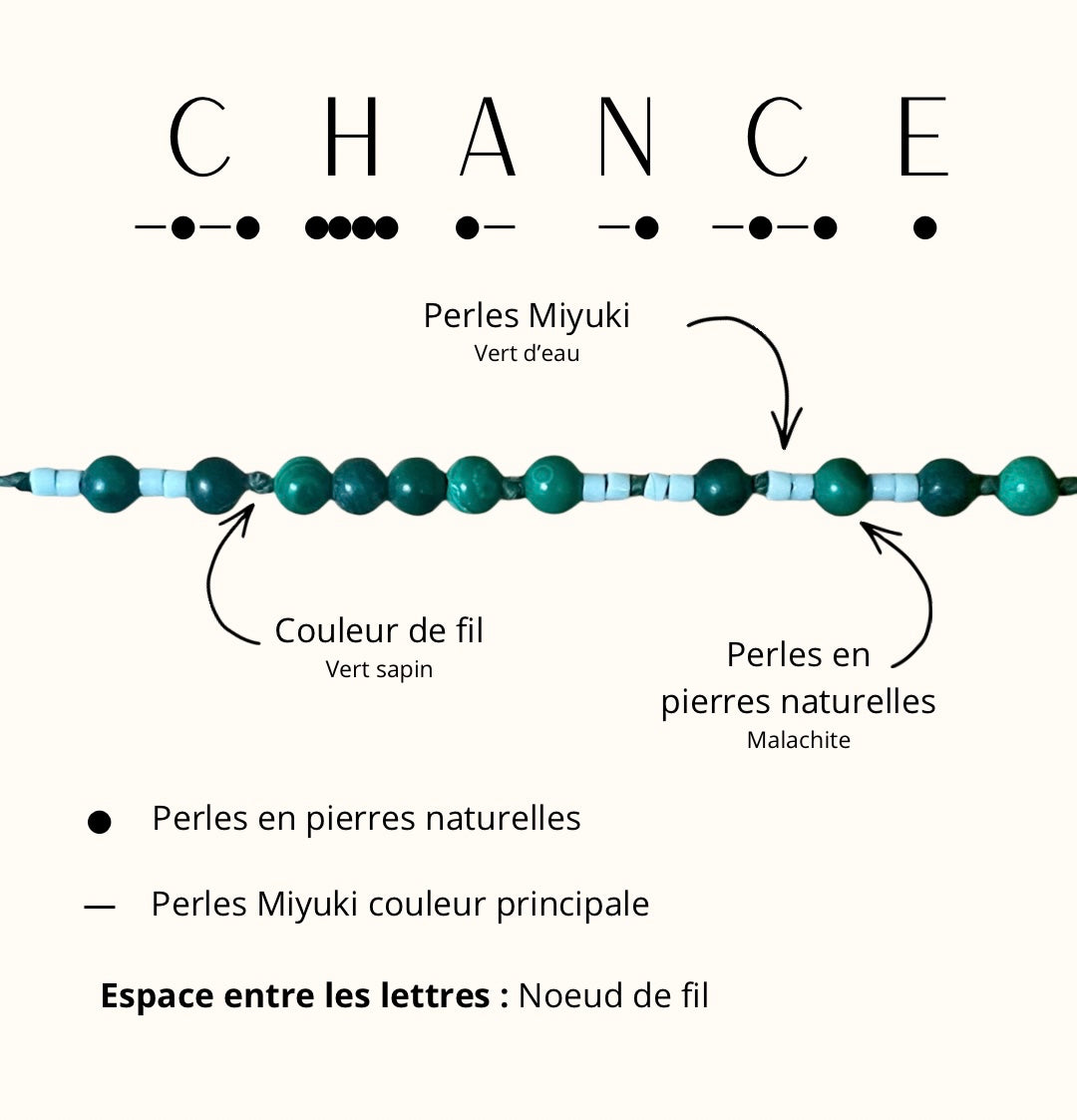 ❤️ L'association des perles et des tissages forme le mot "Chance" en morse. Puisqu'une image vaut mille mots, l'explication se trouve dans les photos de cette fiche produit.